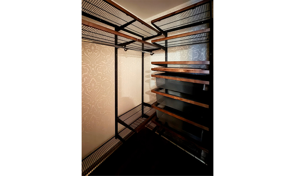 - Полки с декором по нижней части гардеробной для хранения обуви или контейнеров и коробок с вещами.