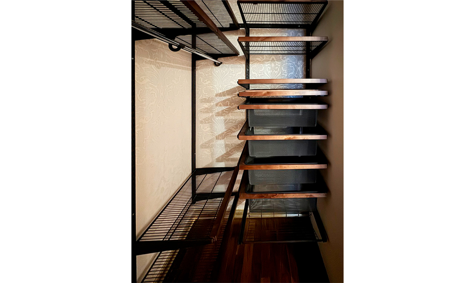 - Несколько выдвижных мелкосетчатых корзин в деревянных рамках, в которых удобно хранить вещи в сложенном виде или другие предметы гардероба наших заказчиков.