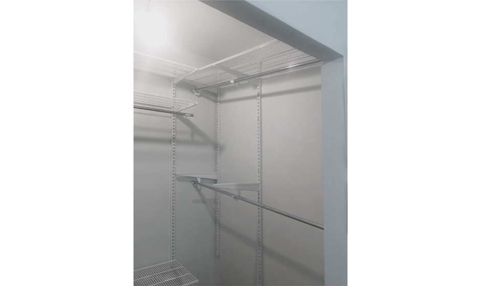 - Металлические проволочные полки в верхней части гардеробной для антресольного хранения вещей, а также чемоданов, контейнеров с вещами, а также елки и новогодних украшений для дома.