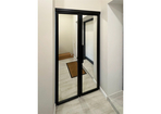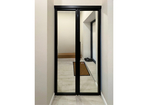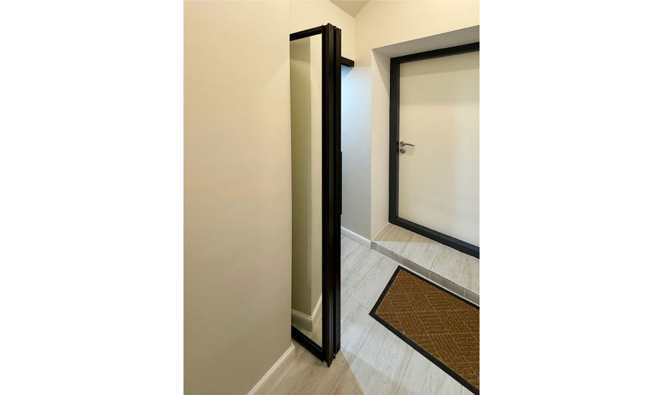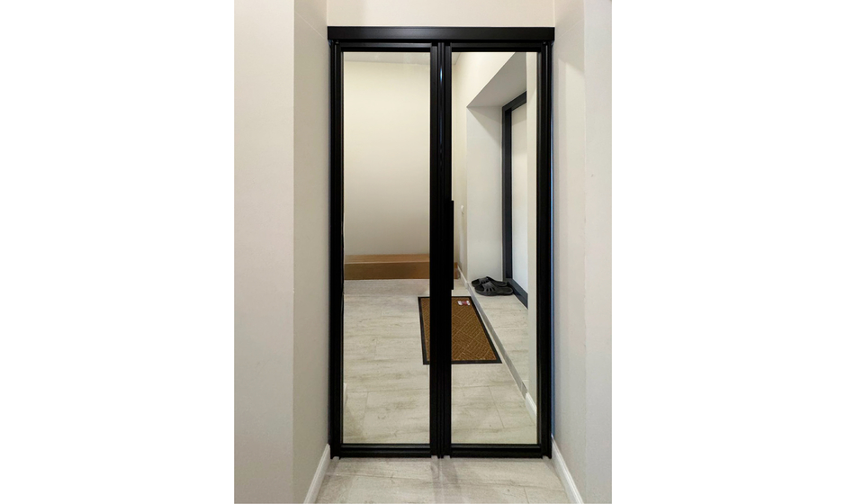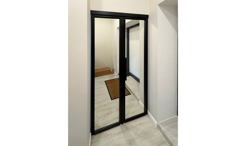 Проект дверей был также предложен нашим клиентам достаточно быстро. Мы предложили двери-купе из профиля Fusion черного цвета. Наполнение дверей – зеркало Silver.