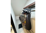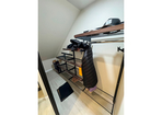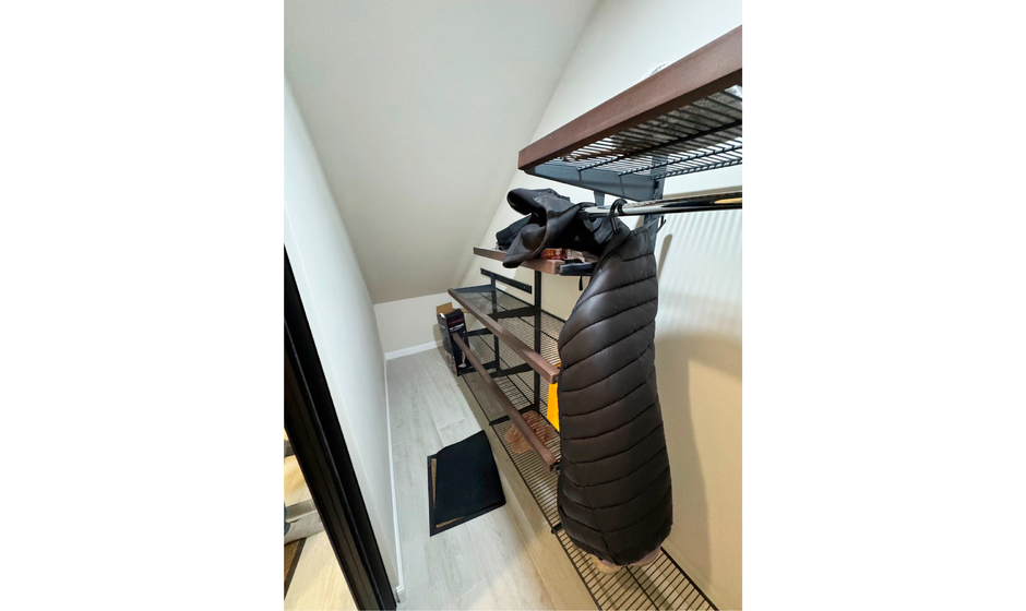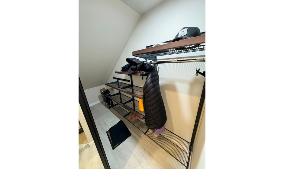 Проволочные полки в нижней части гардеробной для хранения контейнеров с вещами и коробок с обувью.